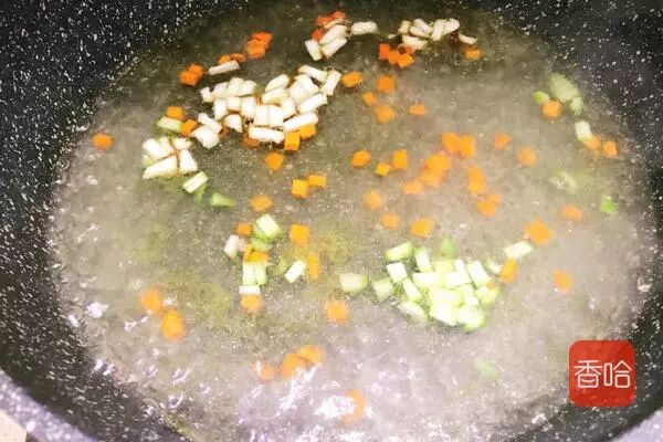 2.锅里烧水,水开后放一点点油下蔬菜丁焯熟。