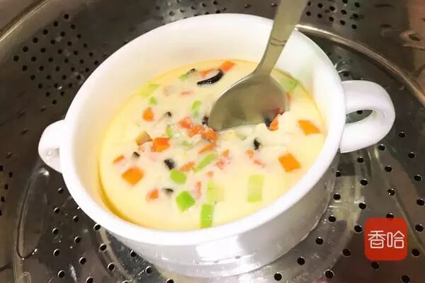 7.盖上盖子继续蒸7-8分钟左右,用勺子检查一下没有稀蛋液就是全熟了。