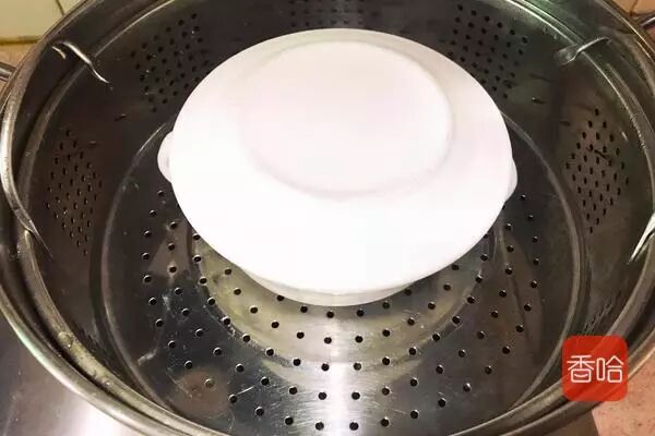 5.倒入蒸碗中,扣一个盘子(或者封保鲜膜边缘戳小洞)放入烧开的蒸锅中。