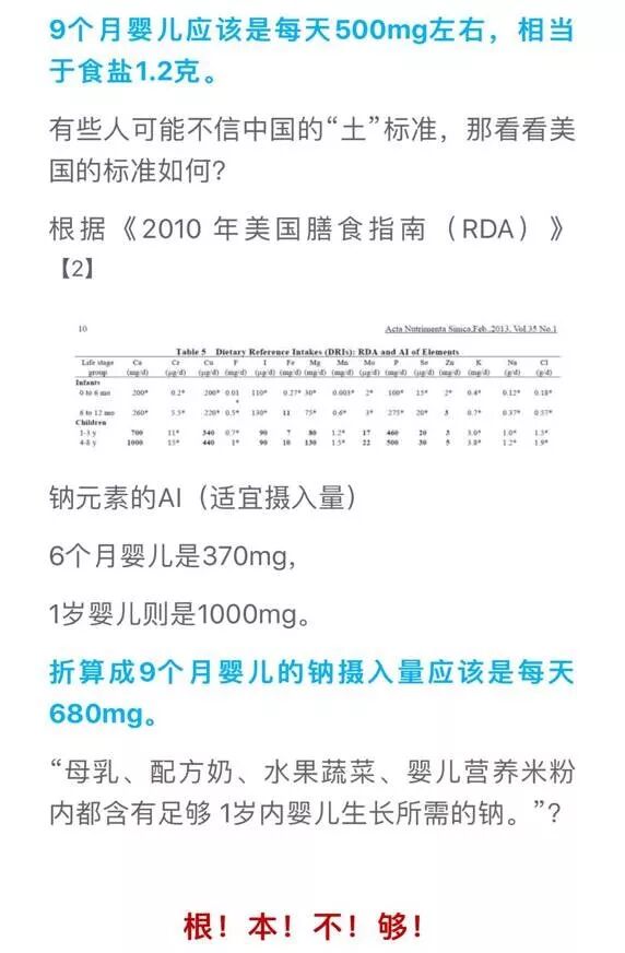 作者引用了2013版《中国居民膳食营养素参考摄入量》,以9月龄宝宝为例,得出钠的每日适宜摄入量是500毫克,又根据《2010年美国膳食指南》,得出9月龄宝宝每天钠的适宜摄入量是680毫克。 作者举例的9月龄宝宝,就作者引用的两个指南来看,适配的年龄段是6-12月龄,在2013版《中国居民膳食营养素参考摄入量》里,每日适宜摄入量是350毫克;《2010年美国膳食指南》每日适宜摄入量是370毫克。 但是,作者却根据两个月龄节点的每日适宜摄入量数值差,除以月数推算出9月龄婴儿的每日钠适宜摄入量500毫克或者680毫克,显然超出了指南相应年龄段的适宜摄入量了,也是对指南推荐的参考摄入量的错误解读。