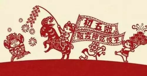初五是五路财神的生日。所谓五路,指东西南北中,意为出门五路,皆可得财。五路财神即东路招财神、西路进宝神、南路利市神、北路纳珍神和中路玄坦神。
