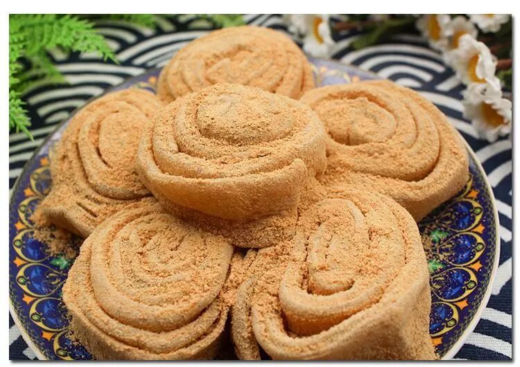 ——米饼是用糯米粉作主料,花生、芝麻、白糖作配料,放入模具打制成圆形,再经高温蒸熟,吃起来别有风味,有“团团圆圆”的寓意。