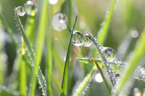 天气渐转凉,会在清晨时分发现地面和叶子上有许多露珠,这是因夜晚水汽凝结在上面,故名。