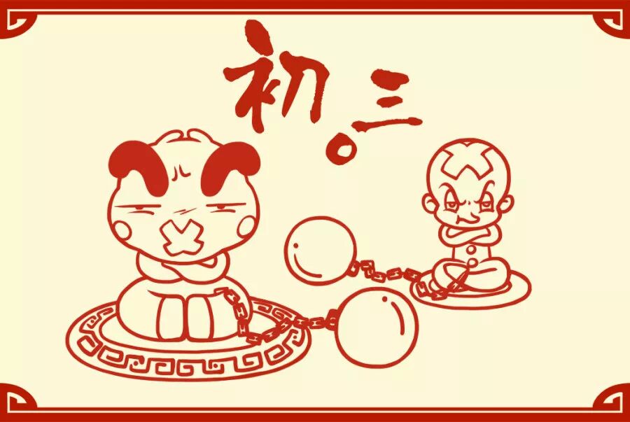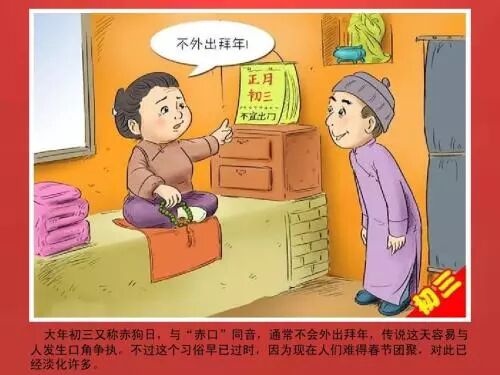 据说在初三跟谁拜年,就会跟谁吵架,因此不宜外出。另外“赤”字有“赤贫”的意思,所以民间也不在这天宴客,以免冲犯“赤狗”,带来贫穷。