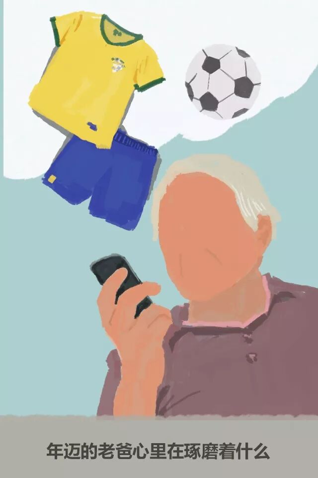 爷爷:明天世界杯有巴西队的比赛,还记得儿子特别喜欢巴西队,小时候还追着我买巴西队的球服呢,谁让我们都是足球迷呢!