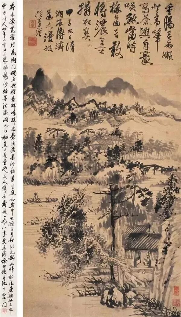 题识:重阳无雨懒登高,笔写苍兴自豪笑煞当时梅道者改将浓墨搨枯焦山,丁子九日清湘石涛济道人漫设于青溪。