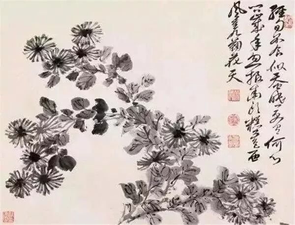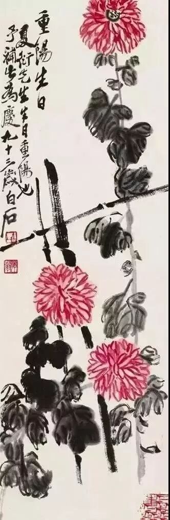 另外,齐白石93岁那一年,画了一张《重阳生日》给生于重阳的夏衍先生庆生,画面内容也是菊花。
