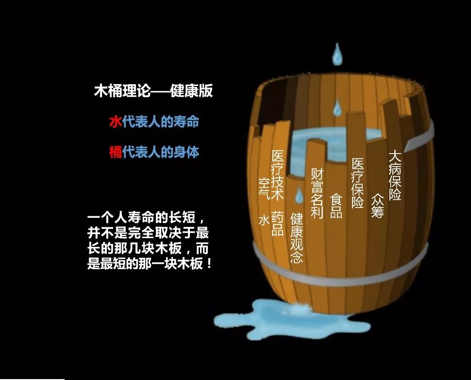 所以,医疗技术、药品、大病保险、医疗保险、众筹、个人的财富名利、食物、空气、水、健康观念象征着每一块木板,这些木板用于维护我们的身体,对人的寿命起着至关重要的作用。