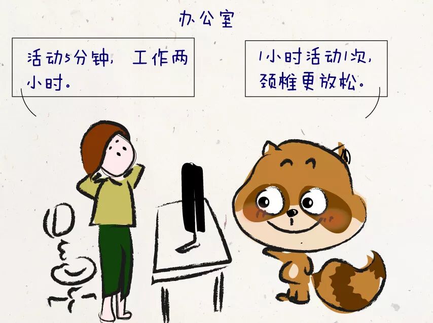 工作1小时后习惯性抬抬头,或起身走走,让颈肩部放松5~10分钟。