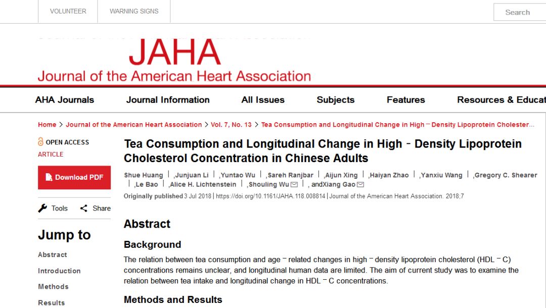 《美国心脏协会杂志(JAHA)》发表一项研究,用大数据证明了喝茶可以降低心血管病风险。