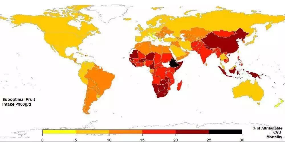 世界各国因水果摄入量不足而导致的心血管疾病死亡率百分比