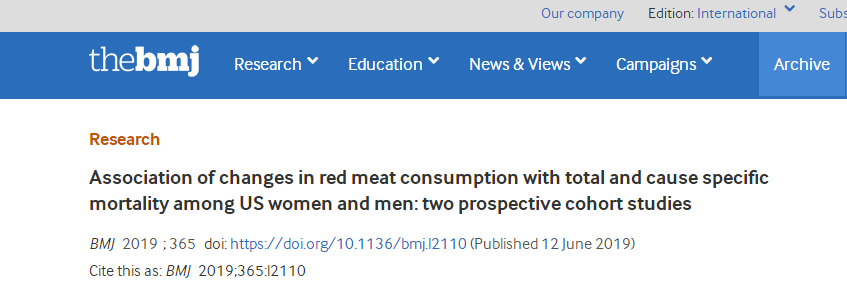 来自美国和中国的一支团队,纳入了53553名30~55岁女性、27916名40~75岁男性作为对象,使用他们自行报告的问卷并随访8年,分析不同程度的红肉消费量与全因死亡率之间的关系。这些受试者在入组前都排除了癌症和心血管病。