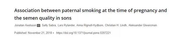 研究人员对104名17~20岁的瑞典男性进行了调查,在排除了母亲孕产期吸烟史、社会经济因素、男性后代自身吸烟史等因素后发现,父亲吸烟时,其男性后代的精子浓度比不吸烟男性的儿子低41%,精子数量则少了51%。
