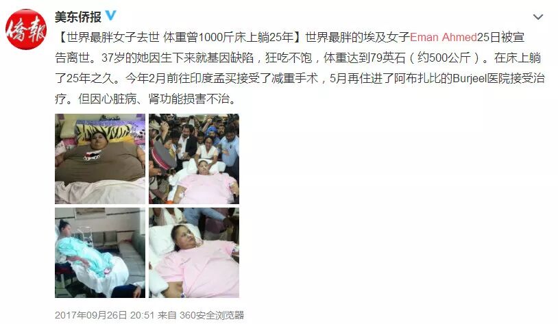 被称为世界最胖女子的Eman Ahmed,因遭受包括心脏病、肾功能损害在内的健康疾病,2017年9月25日被医院宣告死亡。