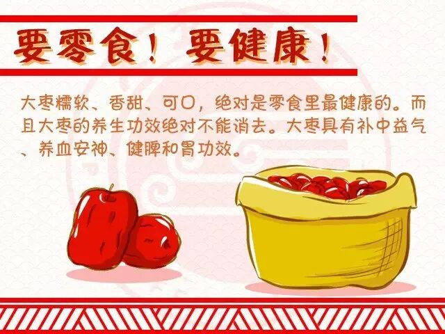 大枣糯软、香甜、可口,绝对是零食里最健康的。而且大枣的养生功效绝对不能消去。大枣具有补中益气、养血安神、健脾和胃功效。而且具有抗肿瘤、抗突变、抗氧化、抗衰老、抗过敏、保肝、抗炎、镇静催眠、降血压、降低血清胆固醇等作用。
