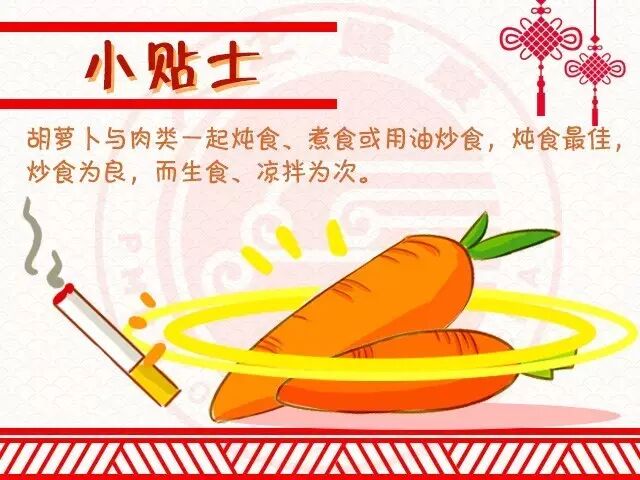 胡萝卜中富含β-胡萝卜素,多年来的研究表明,β-胡萝卜素可使肺癌、胃癌、乳腺癌、脑癌及其他癌症的发病下降1/2~2/3,尤其是在防治肺癌上有独特的疗效。β-胡萝卜素能够迅速降解吸烟引起的血液中的高尼古丁,减缓肺部功能退化,让肺更“年轻”。实验研究证实,β-胡萝卜素可以抑制多种肿瘤细胞的生长并可诱导肿瘤细胞凋亡。