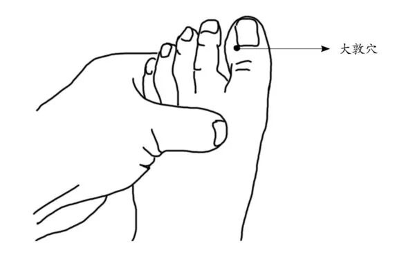 取穴方法:可采用正坐或仰卧的姿势,大敦穴在脚拇趾靠第二脚趾那一侧甲根边缘约2毫米处。每天按揉1~2次。