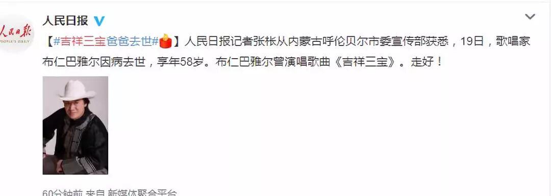 然而不幸的是,人民日报记者从内蒙古呼伦贝尔市委宣传部获悉,19日,歌唱家布仁巴雅尔(吉祥三宝中的父亲)因病去世,享年58岁。