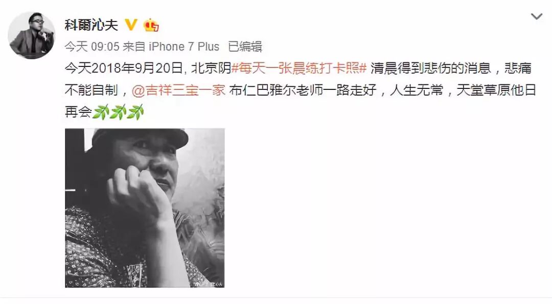 著名音乐人、创作人科尔沁夫也发文称:“2018年9月19日,清晨得到悲伤的消息,悲痛不能自制,布仁巴雅尔老师一路走好,人生无常,天堂草原他日再会。”