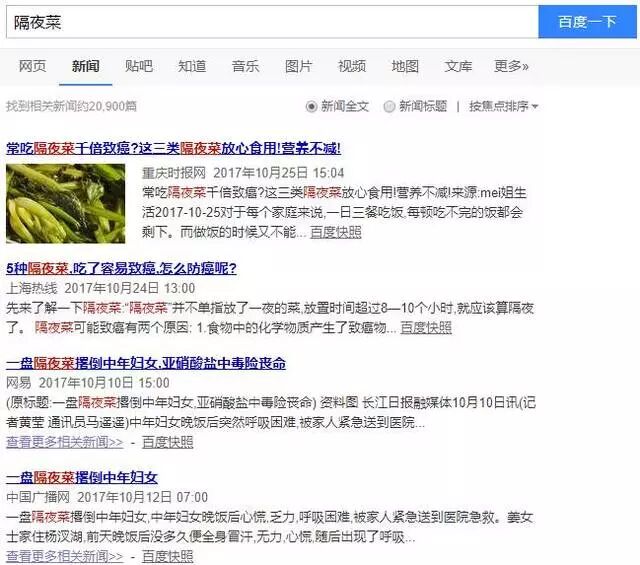 《这六种隔夜菜堪比毒药,千万别吃》、《隔夜菜伤肝肾、会中毒》、《隔夜菜万万吃不得,一不小心会要命》等文章广泛流传。文章配以各种案例,称隔夜菜会产生大量的亚硝酸盐,威力猛于虎。