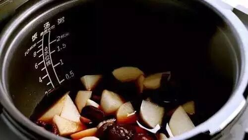 3、把白萝卜块儿和泡好的香菇连同泡香菇的水一同倒进电饭煲内胆,也可以用普通的煮锅。(注意:泡香菇的水不要丢弃,它含有很多营养物质,也有香菇的香气。)