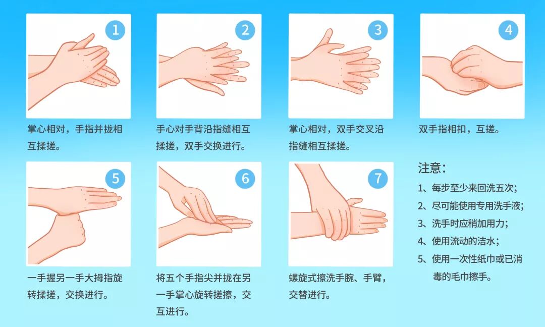 从公共场所返回、咳嗽手捂之后、饭前便后,用洗手液或肥皂,流水洗手,或者使用含酒精成分的免洗洗手液。
