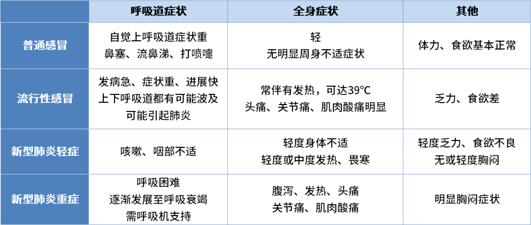 虽然感冒、流感和新型肺炎的症状有很多相似之处,但我们还是能从一些细节上将其进行区分: