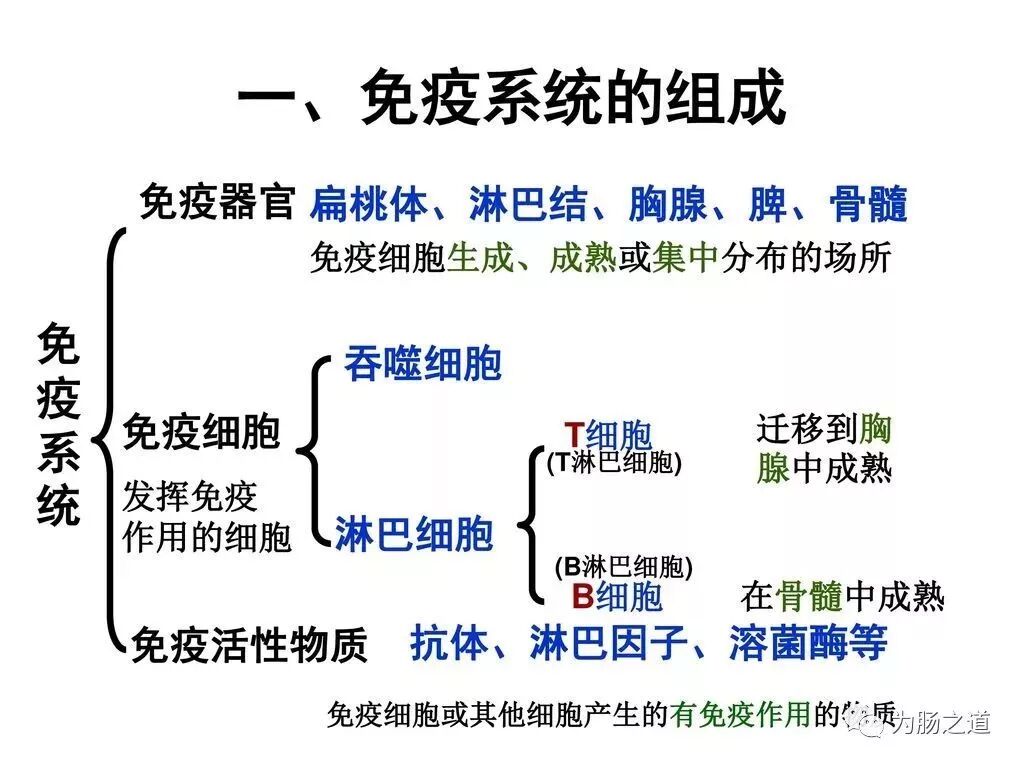 免疫系统的后备军(多能干细胞)是在骨髓中制造的,免疫系统的培训体系是在它们的“军校”里进行的。T淋巴细胞的成熟在胸腺中进行,B淋巴细胞则是就在骨髓中完成。