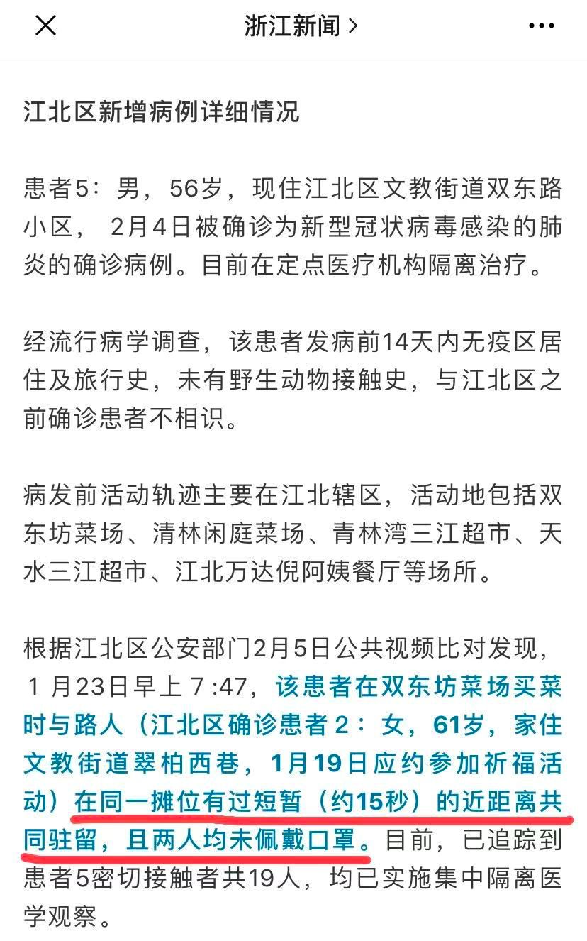 据浙江日报2月5日报道,宁波江北区1例新增的56岁病例,在发病前14天内没有疫区居住及旅行史,没有野生动物接触史,也和当地之前的确诊患者不相识。