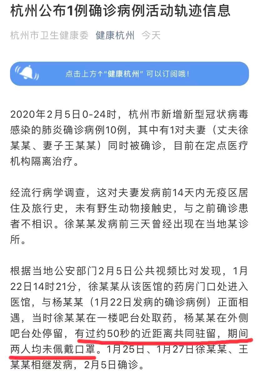 无独有偶,据浙江杭州卫健委2月6日发布的最新消息,一对杭州夫妻同时被确诊新型肺炎。