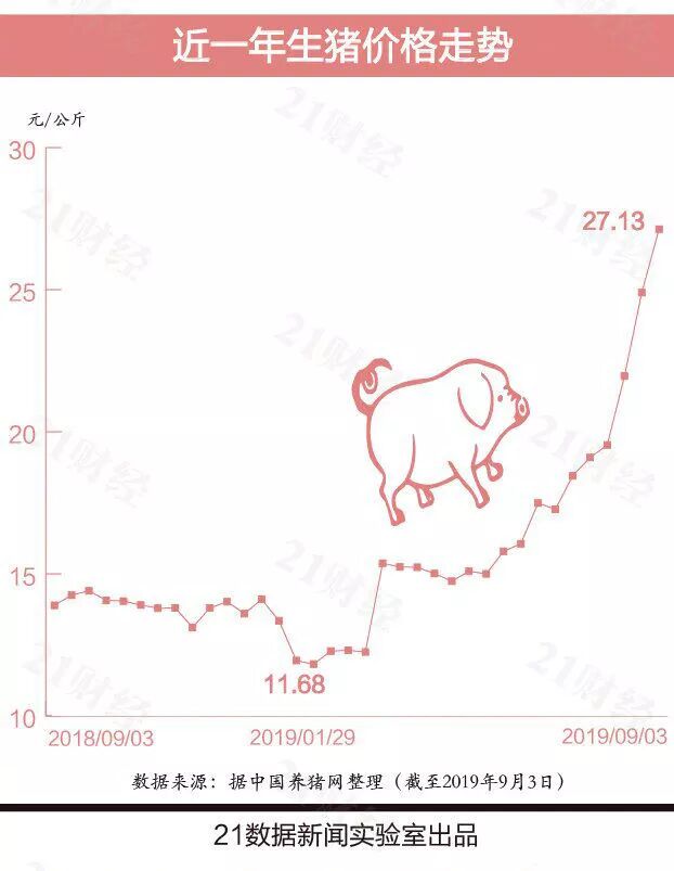 其中,6月猪肉批发价格为21.63元/公斤,对比2月价格,4个月内涨了3.44元;到了9月份,仅两个多月,价格又上涨了13.24元。