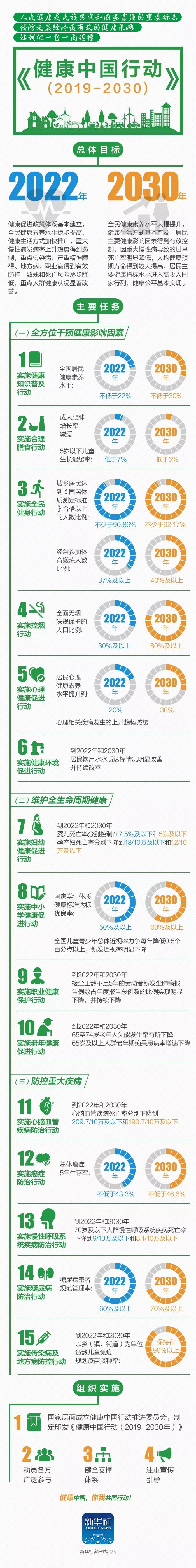 《意见》强调,国家层面成立健康中国行动推进委员会,制定印发《健康中国行动(2019-2030年)》,细化上述15个专项行动的目标、指标、任务和职责分工,统筹指导各地区各相关部门加强协作,研究疾病的综合防治策略,做好监测考核。要动员各方广泛参与,凝聚全社会力量,形成健康促进的强大合力。要加强公共卫生体系建设和人才培养,加强财政支持,强化资金统筹,优化资源配置,加强科技、信息支撑,完善法律法规体系。要注重宣传引导,及时发布政策解读,设立健康中国行动专题网站,以有效方式引导群众了解和掌握必备健康知识,践行健康生活方式。