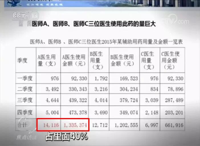 其中有三个医生开了320万元的药,占里面40%,这个简直是吓人的事。有个医生一年用到14000支,金额达到130万元,平均一个月用10万多元!