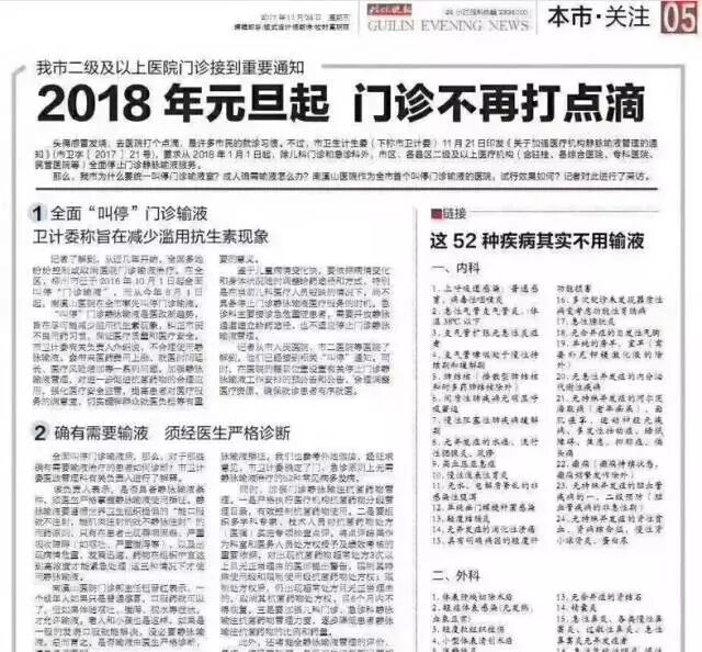 近日,《桂林晚报》第五版,一则“我市二级及以上医院门诊接到重要通知,2018年元旦起门诊不再打点滴”的标题,引发了大家关注。