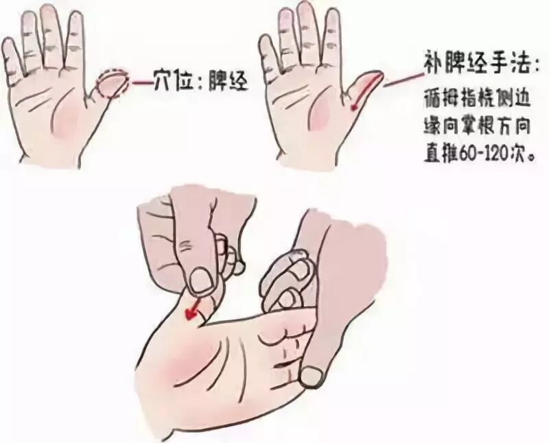 手法:左手中指或无名指夹住小儿左手四指,再以拇指与中指捏住小儿拇指,操作者用右手拇指蘸滑石粉后,直推小儿脾经穴,从拇指指尖推向拇指根,,单方向直推,不宜来回推。