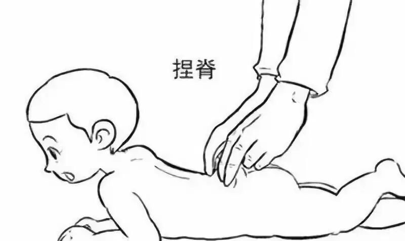 手法:孩子俯卧,背部裸露,涂抹适量滑石粉,用双手的中指、无名指和小指握成半拳状,食指半屈,拇指伸直对准食指前半段,然后顶住患儿皮肤,拇、食指前移,提拿皮肉,同时向上捻动,自尾椎两旁(即脊柱两侧)双手交替向前推动至大椎穴(脖后突出位)两旁。一般每天或隔天捏脊1次。