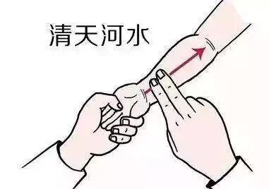 手法:天河水位于前臂正中总筋至曲泽成一直线。用一只手握住孩子的手腕,使其掌心向上,然后用中指、食指指腹自孩子腕横纹直推向肘横纹,推100-200次。
