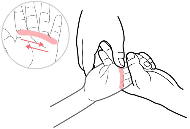 手法:在掌面食指、中指、无名指和小指掌指关节横纹处,用大拇指分别推各手指的小横纹,推50-100次。