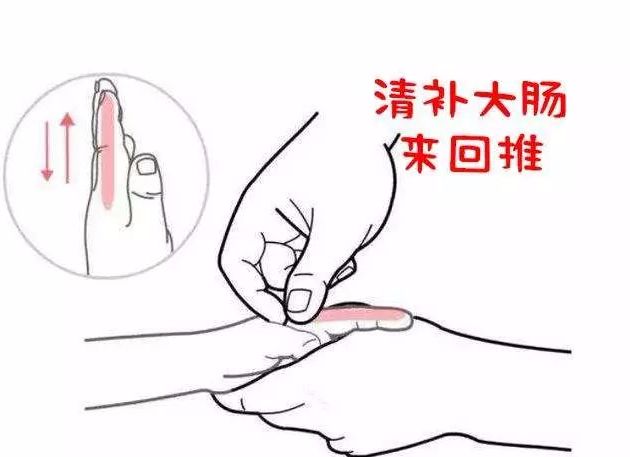 手法:从患者虎口向食指端推,为清大肠;从食指端直向虎口推,为补大肠;来回推,为清补大肠。