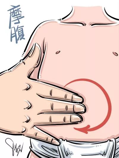 用手掌掌面或食指、中指、无名指和小指并拢,在腹部做顺时针环形摩动称摩腹,操作3分钟。