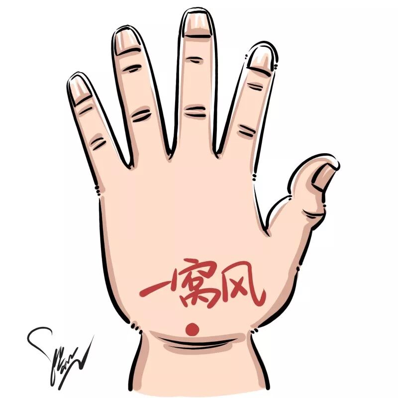 操作:可掐,揉。用中指或拇指指端按揉之,称为揉一窝风,揉100~300次,掐3~10下。