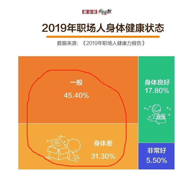 有数据显示,2019年职场人的身体健康状况,“非常好”的仅占5.5%,而处于亚健康状况的,就高达76.7%。