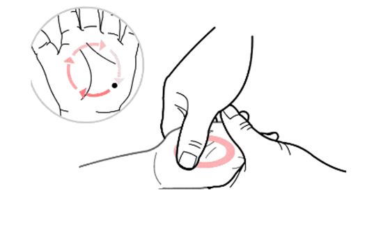 做法:以图中黑点为起点,做顺时针作画圆,运的感觉为接触皮肤,又不产生压力,又像是悬空,想象八卦那种柔和感。