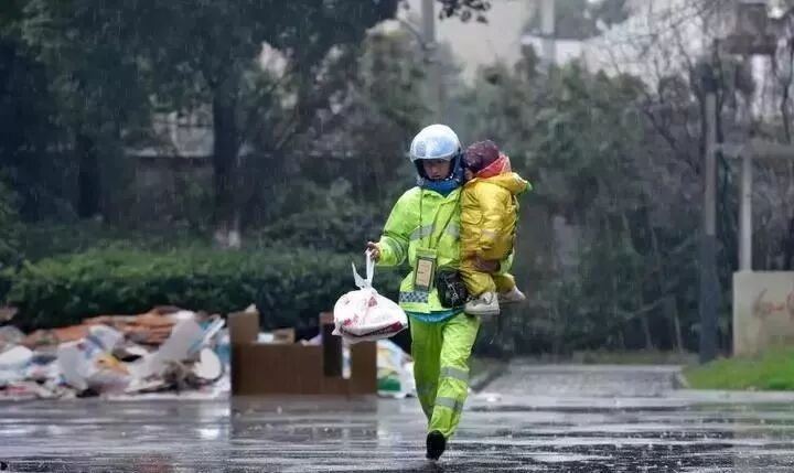在嘉兴的暴雨天,这位独自抚养女儿的单身父亲,一只手紧紧地抱住女儿,另一只手拿好要送的外卖。