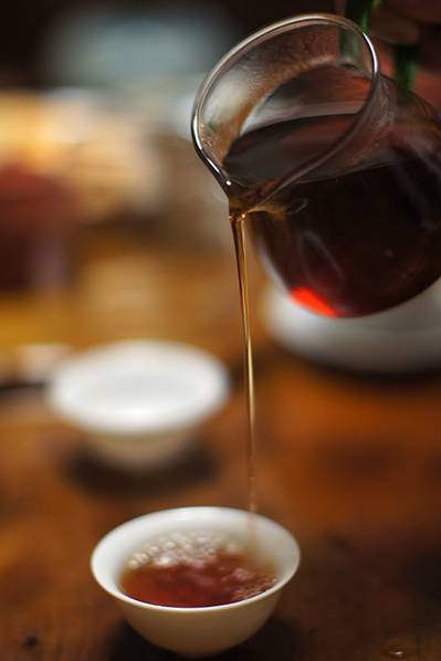 三、冲泡技巧:根据茶品特点适时调整投茶量、茶水比、浸泡时间(如黑砖茶砖身较紧实,冲泡时间宜稍长,散茶如天尖宜较快出水),投茶多、加水少、浸泡时间长则浓。冲泡策略:减少投茶量、快速出水。