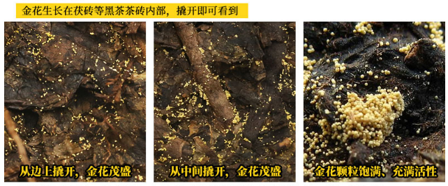 “金花”,实质上是安化黑茶茯砖茶加工过程中,在特定的温、湿度条件下,通过特定工艺生长成的一种有着多种保健功能的益生菌,其产生的黄色闭囊壳似细小花斑,均匀地附着在茯砖茶中,俗称“金花”。