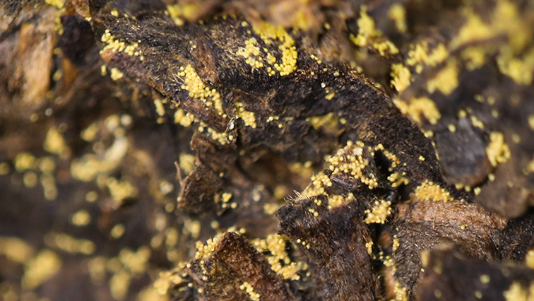"金花"是一种黄色颗粒状菌体,学名“冠突散囊菌”。一般存在于黑茶中的茯砖茶内,茯砖茶最重要的一道工序就是“发花”,金花普遍、茂盛、色泽鲜艳、呈金黄色,不含杂菌,是茯砖茶的重要品质要求。