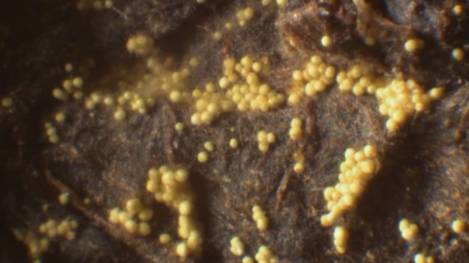 上面长满了密密麻麻的金黄色“霉点”。