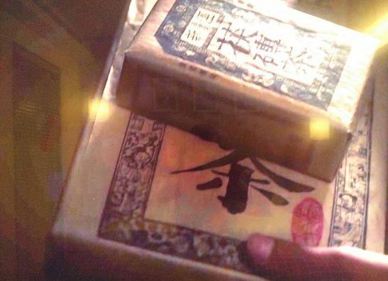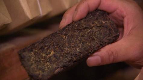 它,看上去黑乎乎的,被制成了茶砖状。