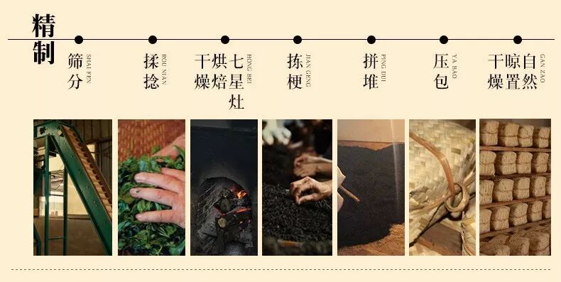 天尖黑毛茶形状规整,色泽乌黑均匀,至少经过一年时间的陈化,再经高温汽蒸、拼堆、包装灌篓、压制定型、插丝透气、凉置等工序方为成品。